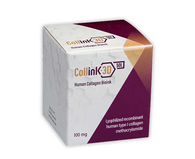 Collink.3D™ 50L is based on lyophilized recombinant human type I collagen (rhCollagen), chemically modified to generate a curable bioink in a dry form, with approximately 50% of the primary amines converted into methacrylamides.