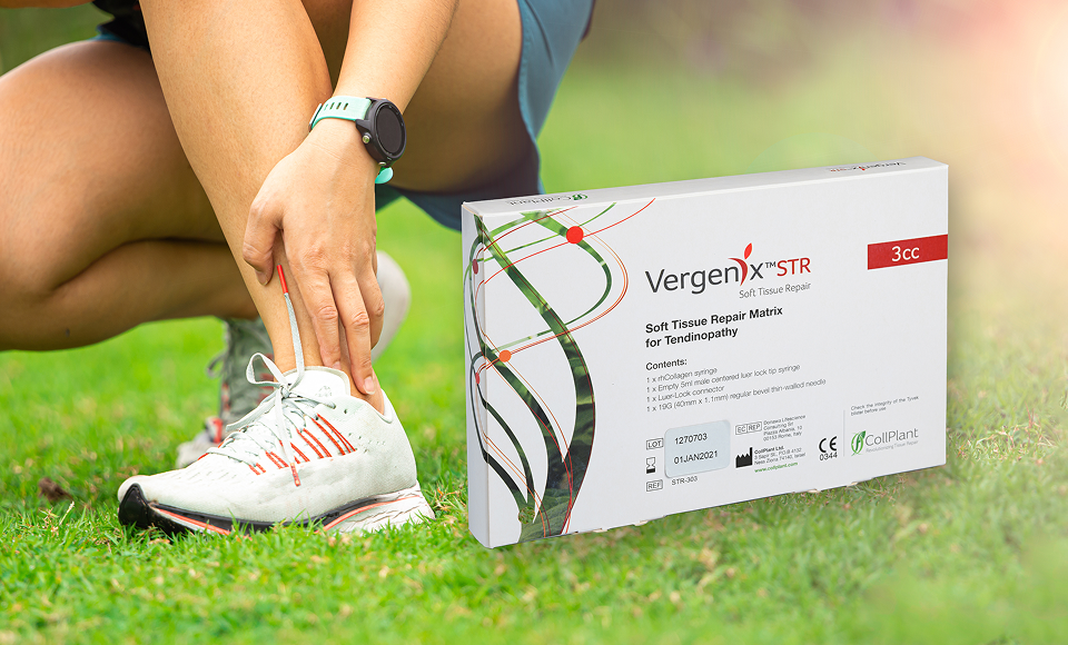 Vergenix™STR is an advanced tissue repair matrix of recombinant human collagen (rhCollagen) to be combined with autologous Platelet-Rich Plasma (PRP). This product is indicated for the treatment of tendinopathy, which affects approximately 2% of the general population and is responsible for over 40% of sports-related injuries.